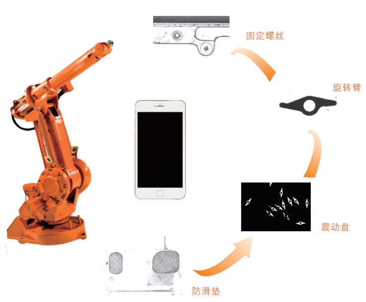 手機制造行業(yè)的高效性,要求加工速度與精度的不斷提高,引入全自動組裝生產(chǎn)線成為必要的應(yīng)用需求。該項目通過”MicroPos“機械手視覺定位算法引導(dǎo)6軸機械手從料盤或料帶上拾取零部件進行精確的手機組裝。