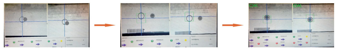 上Filem通過(guò)翻轉(zhuǎn)移動(dòng)到相機(jī)取像位,此時(shí)上Film與下Film同時(shí)出現(xiàn)在相機(jī)視野范圍中,采用虛擬點(diǎn)對(duì)位技術(shù),上Film產(chǎn)生虛擬點(diǎn)作為基準(zhǔn),調(diào)整下Film進(jìn)行對(duì)位貼合,從而避免了上Film和下Film的Mark互相重疊而無(wú)法識(shí)別的問(wèn)題。