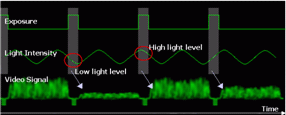 ① 下圖所示為一般區(qū)域掃描 (Area-scan) 攝影機 (取像速度大約在30fps) 在一般室內(nèi)日光燈源 (交流電源, 頻率為60Hz) 下的示波器取像訊號。日光燈的閃爍頻率對這樣的攝影機的曝光時間而言, 并不會有太大影響, 使用者仍然可以取得亮度均勻的影像。