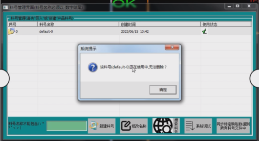(2) 刪除料號(hào):在對(duì)應(yīng)料號(hào)所在行雙擊鼠標(biāo)右鍵,實(shí)現(xiàn)刪除該料號(hào),正在使用的料號(hào)不能刪除。