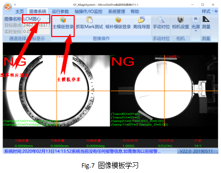 ? Step1:如圖7所示,通過“通道名稱”處選擇我們要進行模板學習的通道:“LCM圓心”,然后進行“主模板登錄”進行圖像的模板學習。