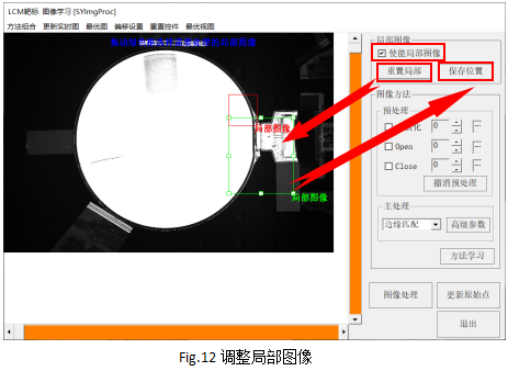 ? Step2:如下圖12所示,勾選“使能局部圖像”,點擊“重置局部”以調整局部圖像的范圍和位置,調整完畢后,點擊“保存位置”進行保存。局部圖像是限定圖像的查找范圍,以提高命中率和縮短圖像處理時間。