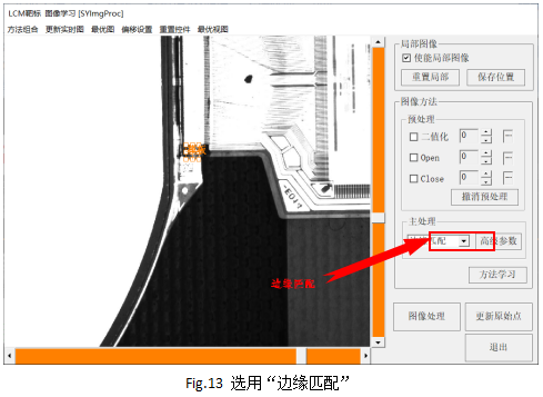 ? Step3:如下圖13所示,下拉重新選擇“邊緣匹配”,黃色的模板框工具則會顯示出來,通過拖拽調整使模板框位置和大小合適,再點擊“方法學習”,則學習記錄當前的模板。