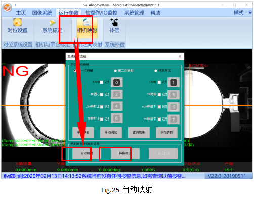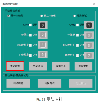 系統(tǒng)全體停止的狀態(tài)下,打開相機映射界面,放置好TP,點擊“啟動映射”,抓點OK完成第一次映射后,再點擊“轉換測試”進行一次轉換測試。