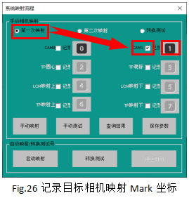 1) 系統(tǒng)全體停止,將帶有兩個Mark點的TP搬運到目標相機下,打開映射界面,勾選第一次映射,再勾選目標相機CAM1,點擊記錄按鈕,系統(tǒng)會抓取兩個Mark點的坐標。