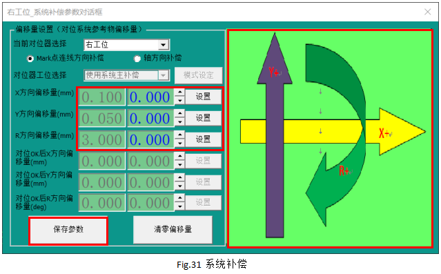 根據補償方向圖示,在右側對應的方向補償寫入補償數值后,點擊“設置”累加到左側的總補償參數中。設置完補償參數退出前必須要點擊“保存參數”,補償才能生效。