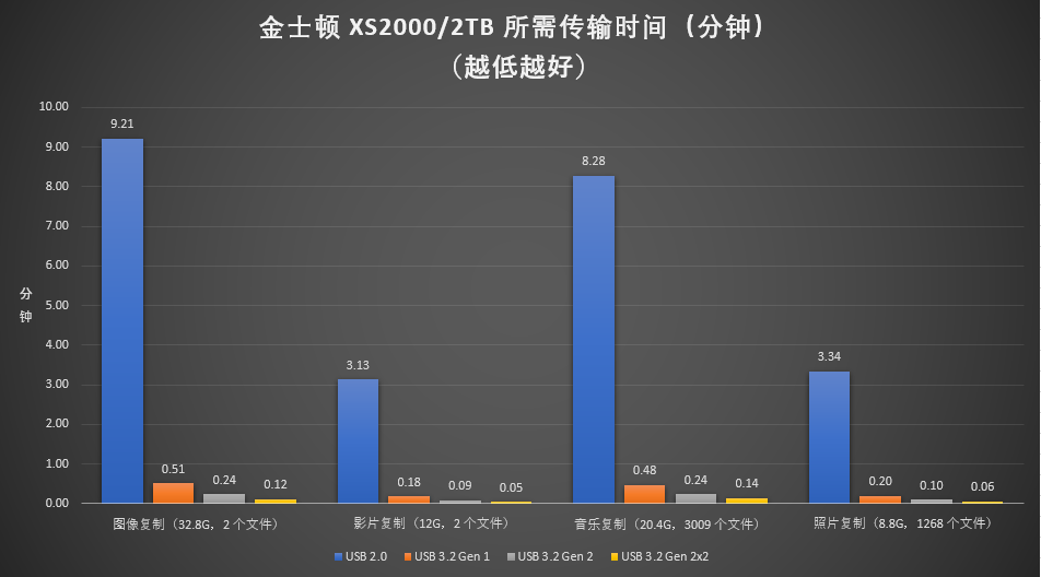 圖1顯示的是不同類型的數(shù)據(jù)傳輸?shù)膫鬏斔俾蕼y試結(jié)果。測試對象是金士頓XS20002TB便攜固態(tài)硬盤。