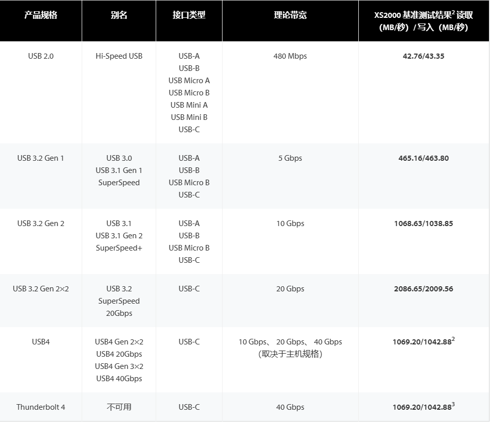 市場上正在推出越來越多支持USB3.2Gen2x2的主機(jī)設(shè)備,而XS2000旨在憑借自身的USB3.2Gen2x2控制器利用這些主機(jī)。只有USBType-C接口支持這項(xiàng)技術(shù)及其傳輸速率。USBType-C接口相較于USBType-A實(shí)現(xiàn)了各種改進(jìn),包括多通道操作功能以及不分“上下”方向的可逆接口。圖2中的圖表顯示的是XS2000在所有受支持USB技術(shù)條件下的基本測試結(jié)果。