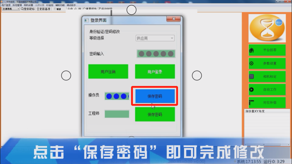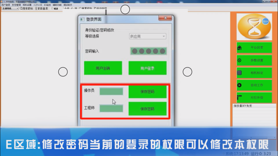 -當(dāng)前的登錄的權(quán)限可以修改本權(quán)限以及以下的權(quán)限,在輸入 框輸入密碼后,點(diǎn)擊“保存密碼”即可完成修改;