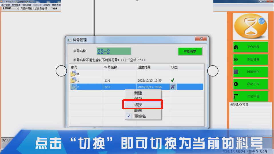 鼠標(biāo)右鍵點(diǎn)擊,彈出框內(nèi)點(diǎn)擊“切換”即可切換為當(dāng)前的料號(hào)