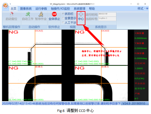軟件上點(diǎn)擊中心,在圖像中可以看到橙色的十字線,這個(gè)為視野中心,在產(chǎn)品上料過(guò)程中,我們需要將產(chǎn)品放置到橙色十字交點(diǎn)即視野中心位置。