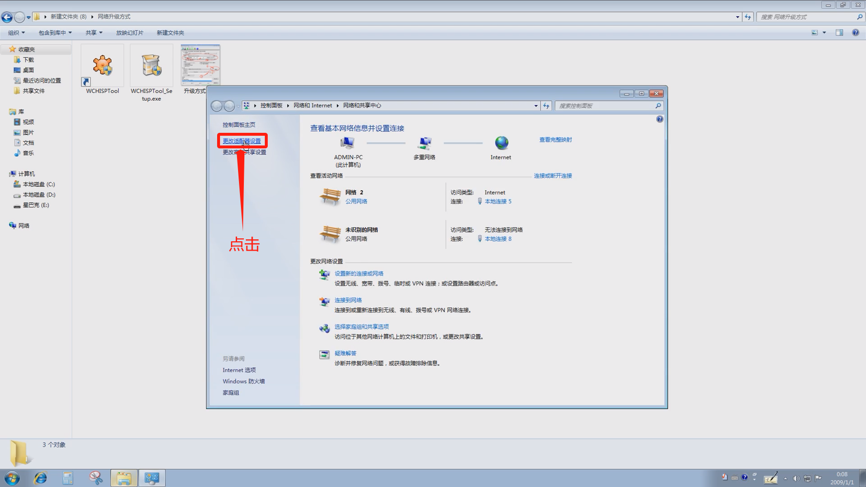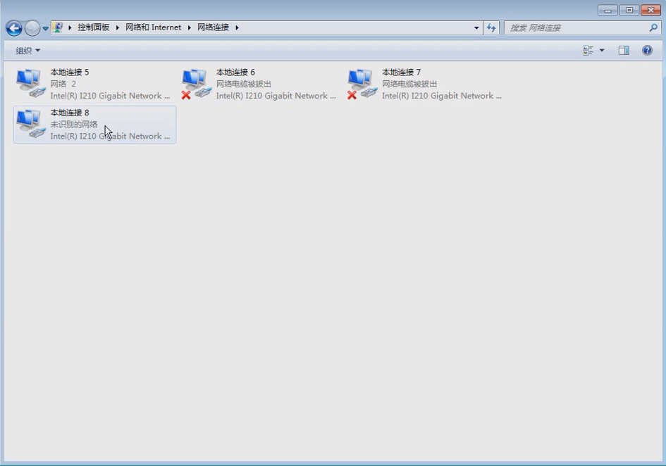 點(diǎn)擊“更改適配器設(shè)置”打開(kāi)網(wǎng)絡(luò)連接界面,檢查網(wǎng)絡(luò)適配器