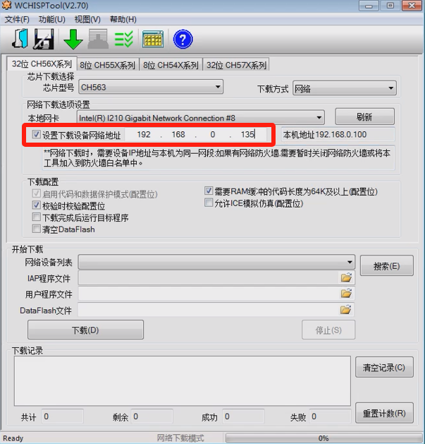 勾選“設(shè)置下載設(shè)備網(wǎng)絡(luò)地址”設(shè)置運(yùn)動(dòng)控制器IP,輸入192.168.0.135