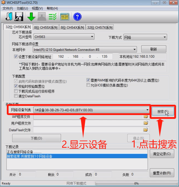 點(diǎn)擊搜索,稍等幾秒后在網(wǎng)絡(luò)設(shè)備列表會(huì)顯示設(shè)備