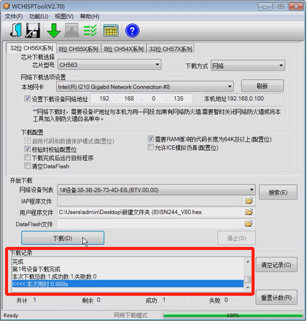 觀察下載記錄窗口,可以看到設(shè)備下載完成,表示升級(jí)完成。