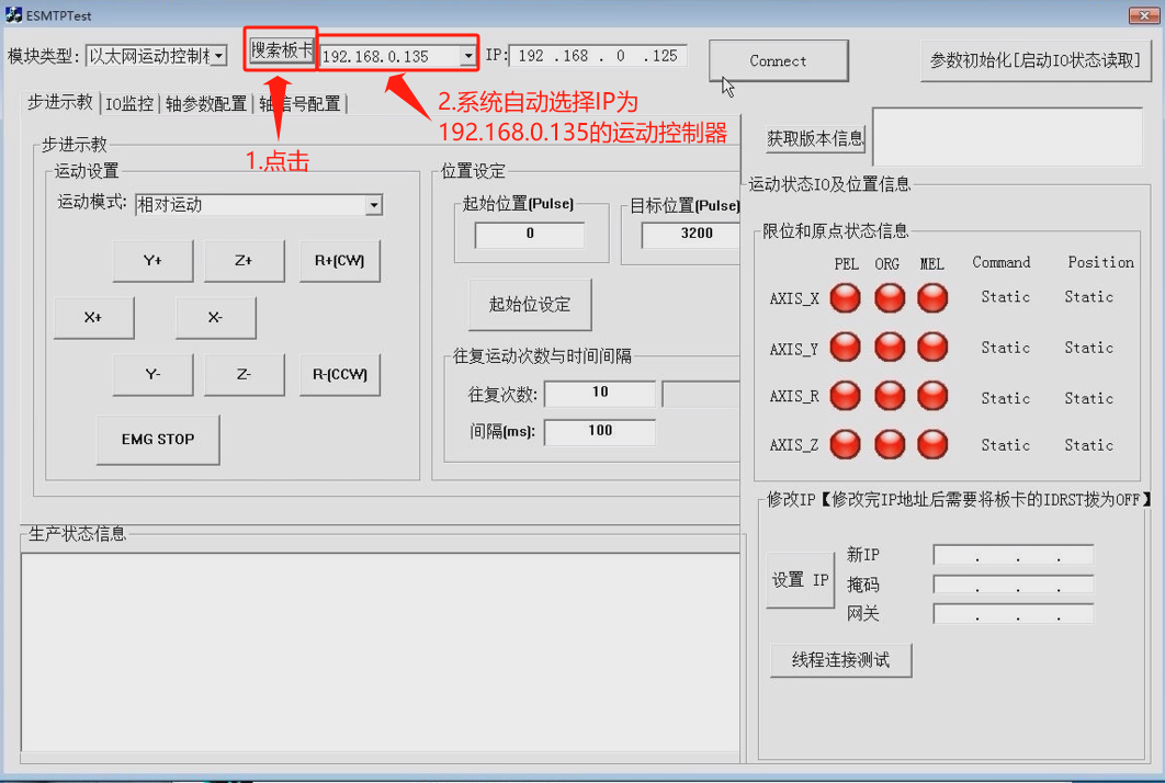 點(diǎn)擊搜索,程序自動(dòng)選擇IP為192.168.0.135的運(yùn)動(dòng)控制器(實(shí)際操作時(shí)候可能會(huì)因?yàn)楝F(xiàn)場(chǎng)情況,IP會(huì)有細(xì)微不同)