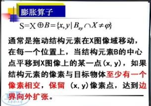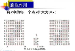 膨脹運算思路:定義結(jié)構(gòu)元素(與模板類似),結(jié)構(gòu)元素在整幅圖像中移動,移動到每個像素點上,如果結(jié)構(gòu)元素與圖像上對應(yīng)像素點的像素值至少有一個像素相等時,保留這個像素點的值。