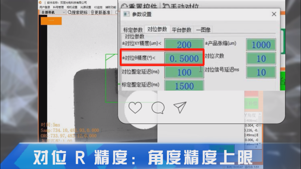 對位R精度:角度精度上限,即視覺對位角度精度偏移量判定值小于設(shè)定值才會輸出對位OK;(單位:um)