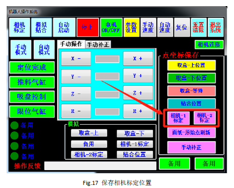 機(jī)械手吸起標(biāo)定板,移動(dòng)到左相機(jī)即相機(jī)1的視野中心,進(jìn)行圖像學(xué)習(xí)后,鼠標(biāo)左鍵點(diǎn)擊“相機(jī)-1標(biāo)定”進(jìn)行左相機(jī)標(biāo)定位置點(diǎn)位的保存。同樣方法將機(jī)械手吸起標(biāo)定板移動(dòng)到右相機(jī)視野中心位置時(shí)候,再進(jìn)行“相機(jī)-2標(biāo)定”保存右相機(jī)的標(biāo)定位置點(diǎn)位。