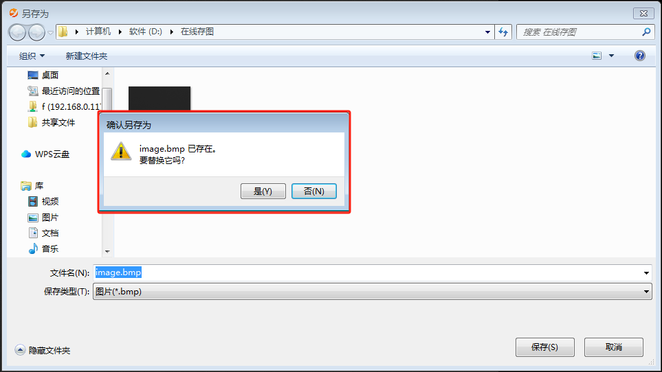 如果文件夾中已有同名文件會(huì)提示xxx.bmp文件已存在,是否需要替換(如下圖所示)