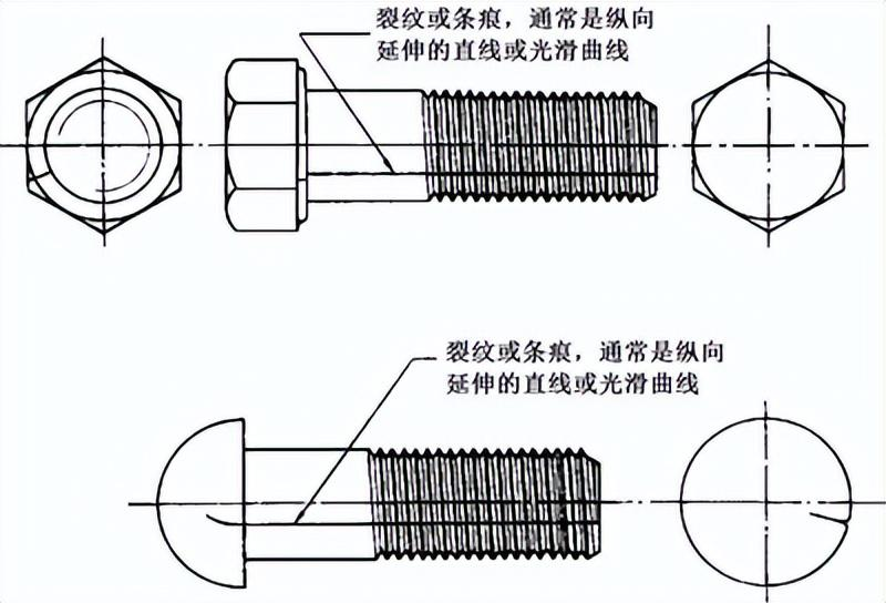 產(chǎn)生原因:原材料的裂紋和條痕通常是沿螺紋、光桿或頭部縱向延伸的一條細(xì)直線或光滑曲線的缺陷。裂紋和條痕通常是制造緊固件的原材料中固有的缺陷。檢測要求:裂紋或條痕的深度:≤0.03d。如果裂紋或條痕延伸到頭部,則不應(yīng)超出對鍛造爆裂規(guī)定的寬度和深度的允許極限,d為螺紋公稱直徑。