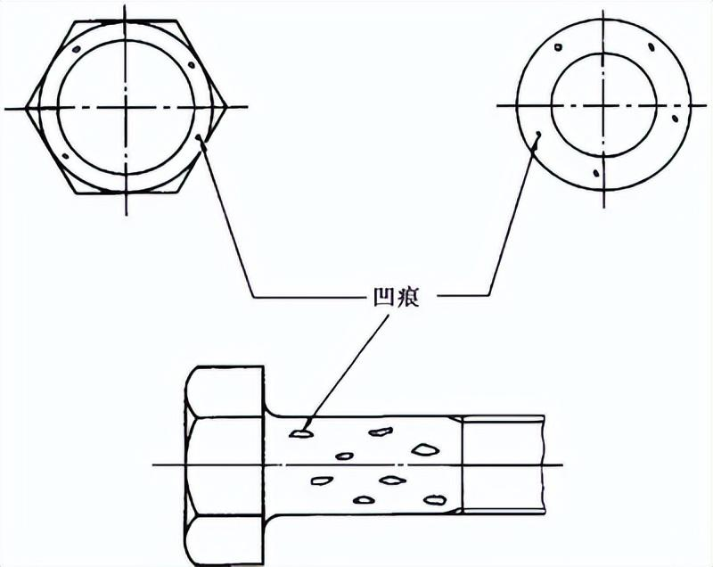 產(chǎn)生原因:凹痕是在鍛造或鐓鍛過程中,由于金屬未填滿而呈現(xiàn)在螺栓或螺桿表面上的淺坑或凹陷。凹痕是由切屑或剪切毛刺或原材料的銹層造成的痕跡或壓印,并在鍛造或鐓鍛工序中未能消除。檢測要求:凹痕的深度 h:h≤0.02d(最大值為 0.25mm)。凹痕的面積:支承面上凹痕面積之和,不應(yīng)超過支承面總面積的 10%。d為螺紋公稱直徑。