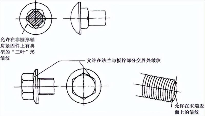 圓頭螺栓和螺釘及六角法蘭面螺栓:螺栓和螺釘及六角法蘭面和圓頭圓周上的剪切爆裂的寬度,不應(yīng)超過下列極限:≤0.08dc(或 dk) (只有一個(gè)剪切爆裂時(shí)) ;≤0.04dc(或 dk)(有兩個(gè)或更多的剪切爆裂時(shí),其中有一個(gè)允許到 0.08dc 或 dk ,其中d ---螺紋公稱直徑;dc---頭部或法蘭直徑;dk---頭部直徑。