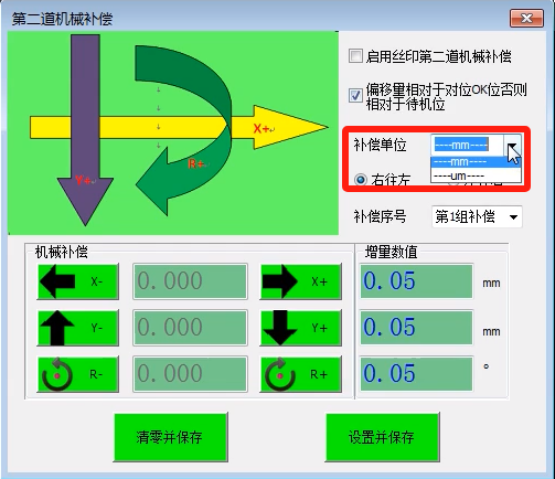 補(bǔ)償單位:點擊可看到有mm毫米與um微米兩個單位可供選擇,根據(jù)需要可以自行進(jìn)行選擇,所選的補(bǔ)償單位便是進(jìn)行機(jī)械補(bǔ)償?shù)脑隽繑?shù)值的單位。