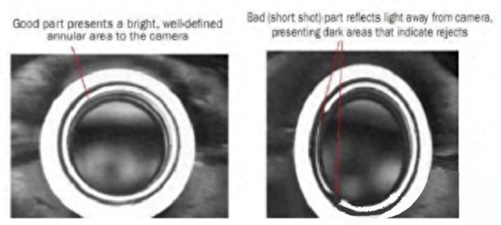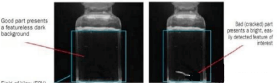 在這個(gè)應(yīng)用當(dāng)中,用暗場(chǎng)照明來(lái)創(chuàng)立一個(gè)明亮的,在暗背景下容易檢測(cè)的感興趣特征。在一個(gè)暗場(chǎng)區(qū)域中光線直接通過(guò)透明的瓶子。大多數(shù)穿透透明對(duì)象的光線不會(huì)被相機(jī)檢測(cè)到。如果材料不規(guī)則,比如有裂紋,一些光線就會(huì)凸顯出這個(gè)不規(guī)則。特別是劃痕創(chuàng)立了一個(gè)內(nèi)部空缺,這里光線折射和反射,以許多角度散射包括返回給相機(jī)。這些光線將很難檢測(cè)的劃痕轉(zhuǎn)換到暗背景下的亮特征。
