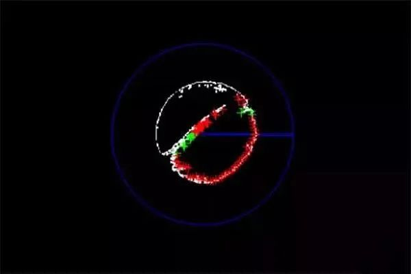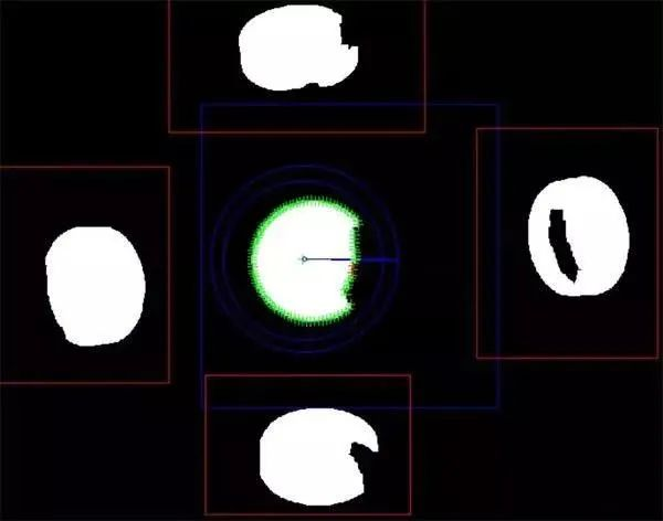 首先,使用視覺軟件中的圖像操作,對(duì)圖像進(jìn)行絕對(duì)差值運(yùn)算,提升藥片邊緣與缺陷對(duì)比度,再利用擊中或不擊中運(yùn)算,將缺損及邊緣對(duì)比進(jìn)一步擴(kuò)大并突顯出來,再通過二值化提取出明顯特征。最后使用崩邊檢測(cè),來計(jì)算邊緣缺損的輻散程度,可辨別出藥片正面是否存在缺損,最終效果如圖5所示。