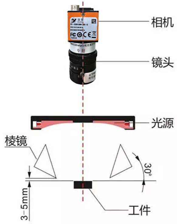因需檢測(cè)藥片所有表面,實(shí)驗(yàn)中采用棱鏡模組進(jìn)行配合打光,通過分次曝光來分別檢測(cè)正面與側(cè)面的缺陷,從而獲取藥片360°全方位的圖像信息。(如圖2,3所示)