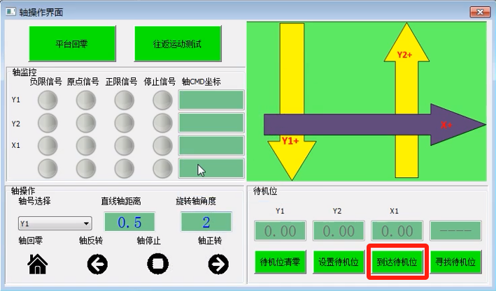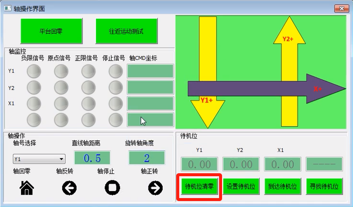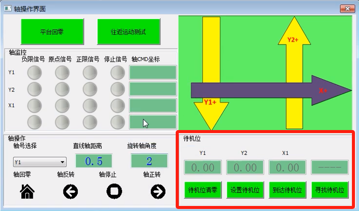 5. 尋找待機位:目前支持XXY/XYY平臺,主要功能:各軸自動碰正負(fù)限位后,計算出正負(fù)限位正中間的位置并且運動到該位置,運動完畢后如果該位置滿足項目需求的工作位,點擊“設(shè)置待機位”將當(dāng)前位置記錄為待機位并保存于文件中;
