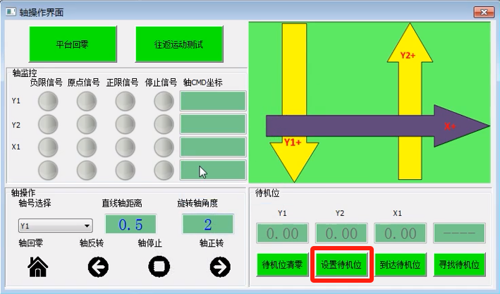 3. 設(shè)置待機位:首先所有軸先機械回零后,將所有軸走到該軸正中間的位置(坐標(biāo)),點擊設(shè)置,將所有軸的當(dāng)前軸坐標(biāo)設(shè)置保存為待機位坐標(biāo)并保存于文件中;