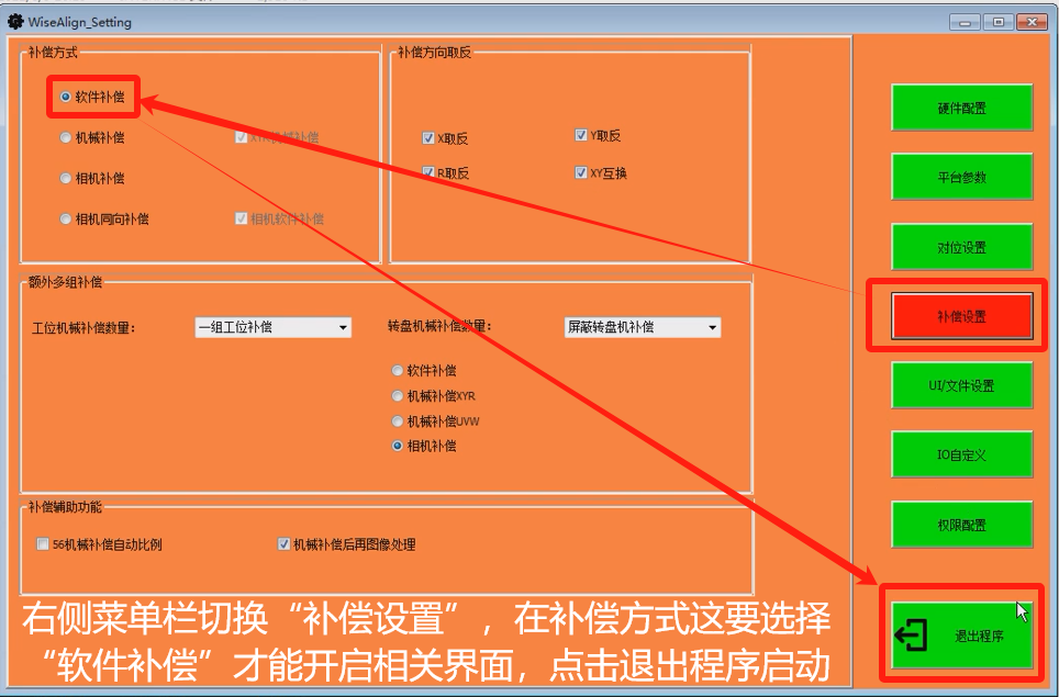 右側(cè)菜單欄,選擇“補償設(shè)置”在補償方式處可以看到當前軟件選擇的補償方式,如果不是軟件補償,勾選上即可,選擇完畢后,點擊退出程序啟動軟件。