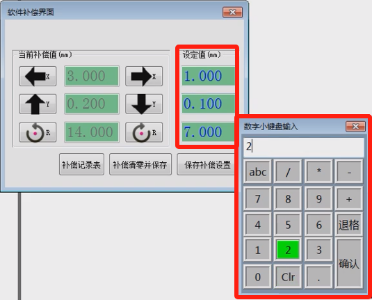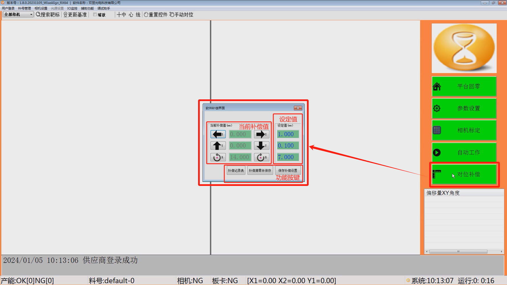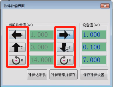 進入軟件,在右側(cè)功能按鍵欄,點擊“對位補償”打開對位補償界面,可以看到界面大致分為三個區(qū)塊“當前補償值”“設(shè)定值”“功能按鍵”