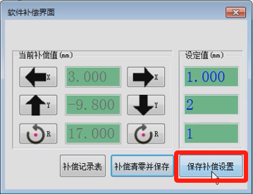 保存補償設(shè)置:點擊下方的“保存補償設(shè)置”按鍵,設(shè)置當前的XYR的補償值并保存料號文件中