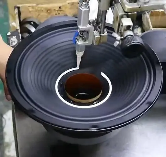 揚聲器又稱“喇叭”。是一種十分常用的電聲換能器件,在發(fā)聲的電子電氣設(shè)備中都能見到它。我們平常使用的揚聲器多為圓形,也有橢圓形、方形、多邊形等形狀。音圈是揚聲器的重要部件,如果音圈有缺陷,就會影響揚聲器的質(zhì)量。當音圈和磁鐵驅(qū)動振動膜聲時,音圈的振動效果會影響揚聲器的音質(zhì)。而音圈的牢固連接有助于提高揚聲器的效果,一般需要達到IP68級強度。因此,音圈的點膠質(zhì)量直接影響了揚聲器的質(zhì)量,因此點膠環(huán)節(jié)在揚聲器中起著非常重要的作用。