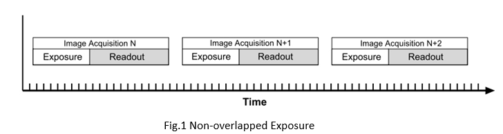 關(guān)于圖像采集過(guò)程中,相機(jī)操作有兩種常見(jiàn)的方法:“non-overlapped”的曝光和“overlapped”的曝光。在非重疊(“non-overlapped”)模式中,每個(gè)圖像采集的周期中,相機(jī)在下一個(gè)圖像采集開(kāi)始前,均要完成曝光/讀出整個(gè)過(guò)程。如Fig.1所示。