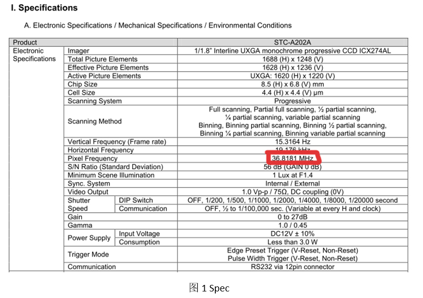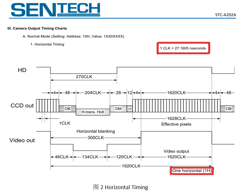 從Spec中可知,其Pixel Frequency為:36.8181MHz,所以1Clock的時(shí)間為1/36.8181Mhz =27.3836ns,接下來(lái)我們看相機(jī)的Timing chart,首先先看HorizontalTiming,見(jiàn)圖2所示: