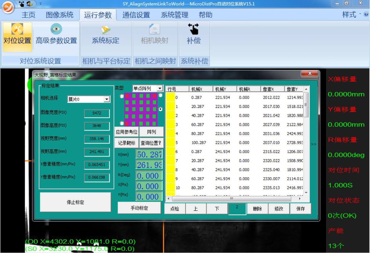 系統(tǒng)采用宮格標(biāo)定,自定義行列數(shù)和間距及旋轉(zhuǎn)角度,通過機(jī)械手發(fā)送的當(dāng)前機(jī)械坐標(biāo),視覺軟件自動(dòng)計(jì)算出宮格機(jī)械坐標(biāo),視覺軟件與機(jī)械手進(jìn)行網(wǎng)口通訊,機(jī)械模組吸取物料到達(dá)指定的機(jī)械坐標(biāo),相機(jī)拍攝物料計(jì)算出像素坐標(biāo)和機(jī)械坐標(biāo)的關(guān)系。