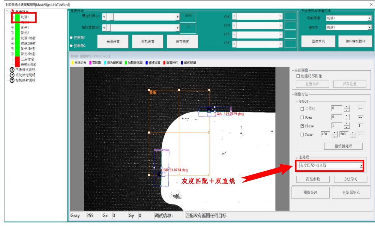 1:調(diào)試流程樹狀圖,調(diào)試哪個(gè)通道就點(diǎn)擊對(duì)應(yīng)的名稱,然后相機(jī)參數(shù)、光源亮度和模板學(xué)習(xí)都是針對(duì)當(dāng)前選中的通道進(jìn)行的。