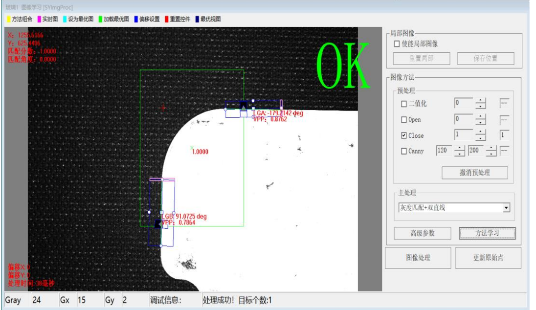 下拉重新選擇“灰度匹配+雙直線”,黃色的模板框工具和藍(lán)色的直線工具則會(huì)顯示出來,通過拖拽調(diào)整先使兩個(gè)直線工具的中線分別與產(chǎn)品的水平邊和垂直邊的邊緣相接,然后調(diào)整模板框位置和大小到合適。,再點(diǎn)擊“方法學(xué)習(xí)”,則學(xué)習(xí)記錄當(dāng)前的模板。注意直線工具的極性和找邊方向