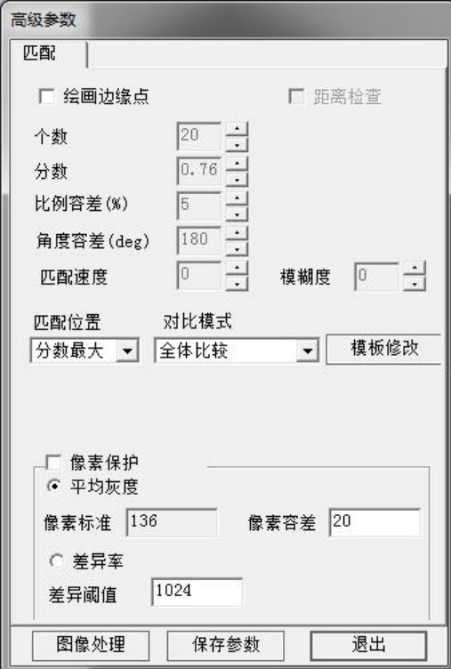 調(diào)整高級(jí)參數(shù)。點(diǎn)擊“高級(jí)參數(shù)”,進(jìn)入高級(jí)參數(shù)界面,調(diào)整參。可根據(jù)實(shí)際情況修改“分?jǐn)?shù)”、“角度容差”、 “有效點(diǎn)比例”、“直線夾角誤差”等參數(shù)