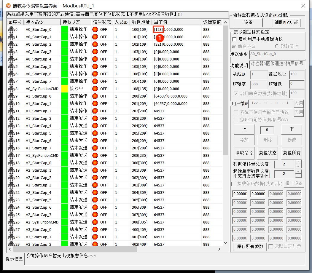 ①是PLC發(fā)送過來,視覺接收到的數(shù)據(jù),點(diǎn)擊②之后才能進(jìn)行編輯右邊的數(shù)據(jù),要保證③IP地址和PLC的地址一樣,修改后點(diǎn)擊下面“保存所有參數(shù)”保存,然后點(diǎn)擊②才可以退出