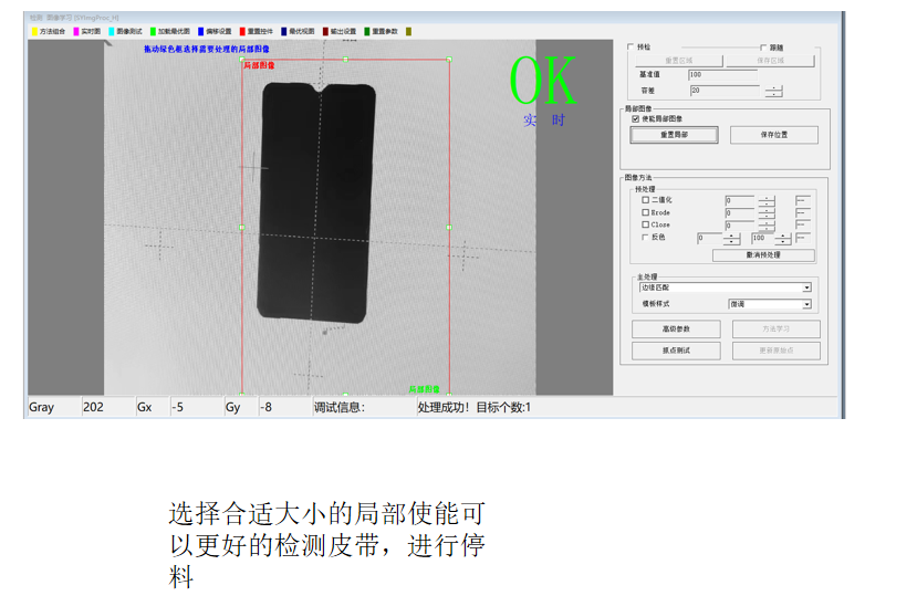 通過(guò)鼠標(biāo)操作ROI選定模板,進(jìn)入【高級(jí)參數(shù)】設(shè)置匹配角度范圍,最小相似度分?jǐn)?shù),并可修改模板。