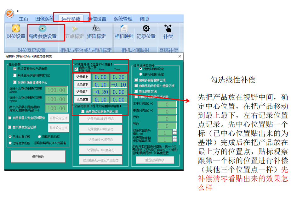 更新基準(zhǔn)位置是作為對(duì)位成功后前往貼輔料位進(jìn)行補(bǔ)償。更新后如有貼合不對(duì)的需注意下料方向是否正確,不正確可通過(guò)設(shè)備機(jī)械改變基準(zhǔn)位來(lái)調(diào)整,如補(bǔ)償方向反了,越來(lái)越大了,需到“運(yùn)行參數(shù)”“高級(jí)參數(shù)設(shè)置”里進(jìn)行“目標(biāo)X、Y對(duì)位取反”進(jìn)行一個(gè)取反。