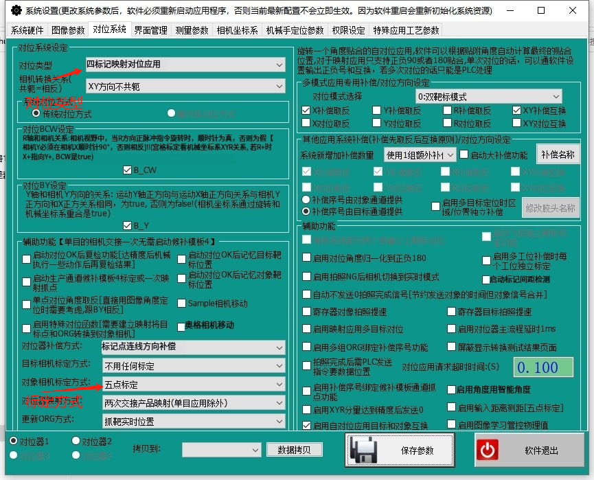 運行參數包括對位設置、高級參數設置、五點標定、補償。