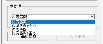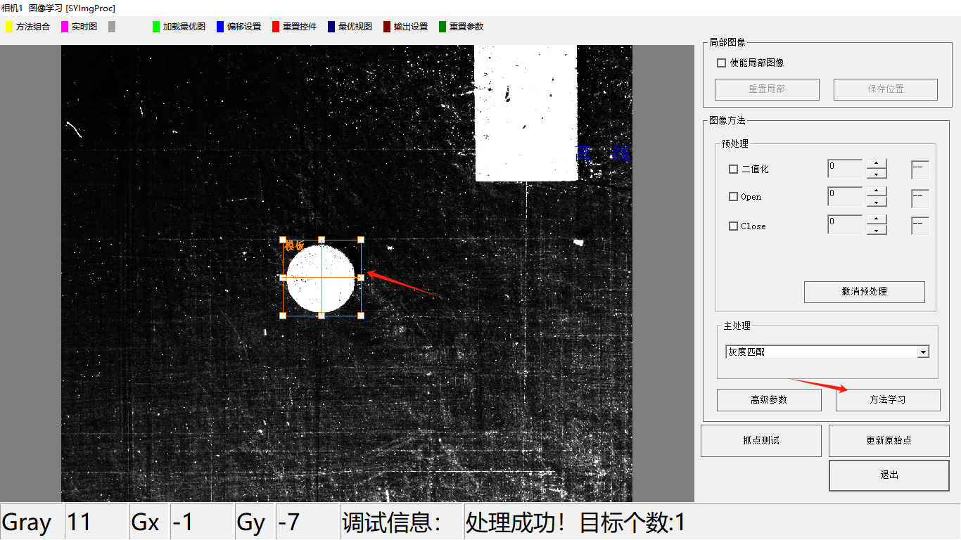2、下拉重新選擇“灰度匹配”,黃色的模板框工具則會顯示出來,調整模板框位置和大小到合適,再點擊“方法學習”,則學習記錄當前的模板。