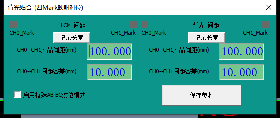 對象產品:(對位平臺上的產品)對位系統(tǒng)會對拍照通道的Mark點與Mark點距離進行測量,間距代表Mark點之間的距離,容差代表Mark點之間距離的容差。例如設定Mark點距離設定為100,容差設定為10,即對應通道Mark點距離不在90~110之間代表測試Mark距離超限,系統(tǒng)會輸出距離超限報警。這樣可以有效管控產品來料誤差,提升對位精度;