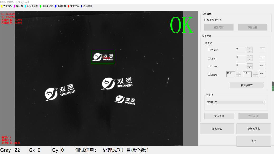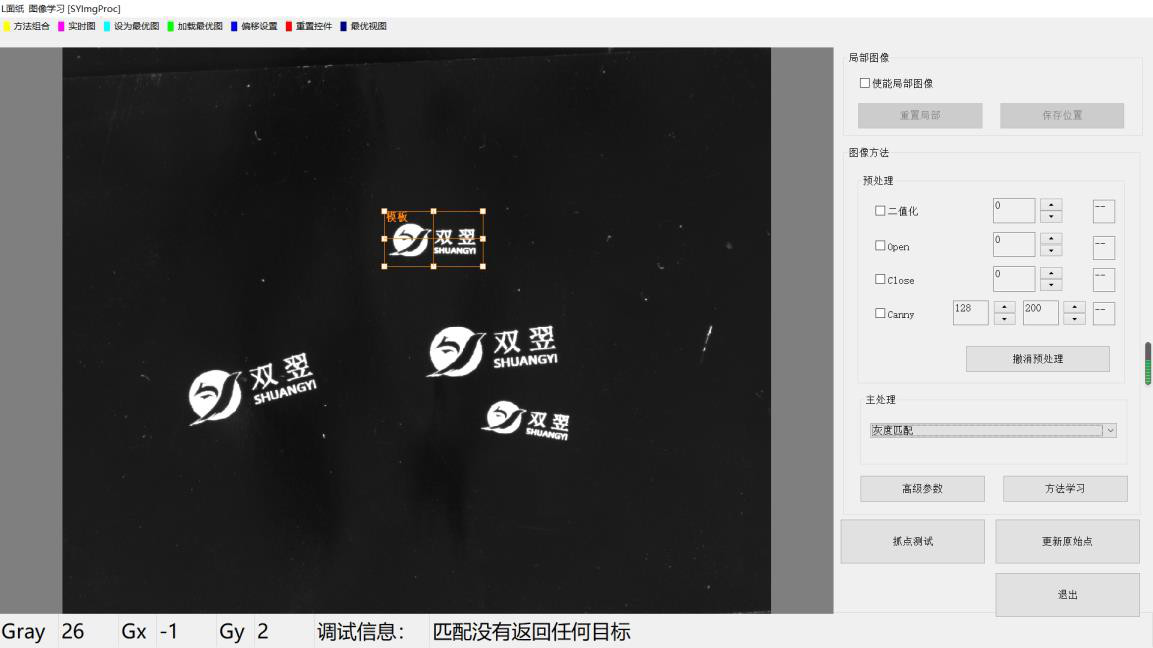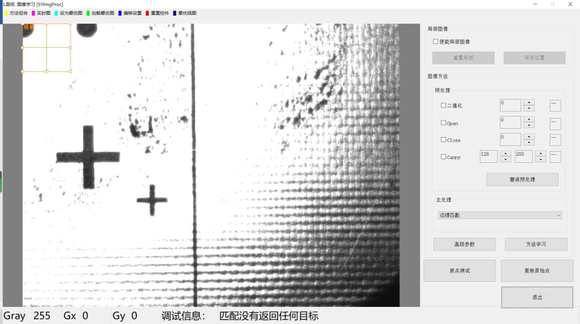【1】在主處理下拉列表中選擇《灰度匹配》,在圖像范圍內(nèi)將出現(xiàn)一個橙色矩形框。如未見矩形框,可點擊圖像上方工具欄《重置控件》。
